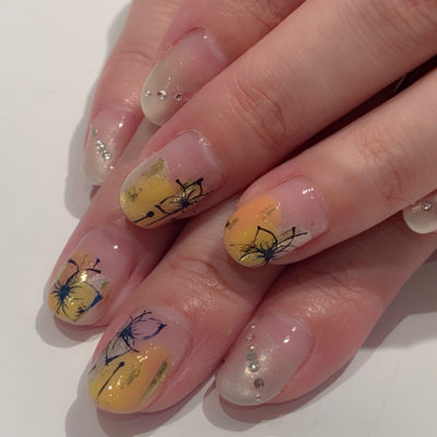 ふんわり乗せたビタミンカラーも、ネイビーのアートで浴衣のような雰囲気に☆