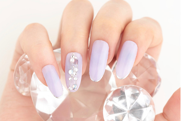 コメント 縦のラインのストーンアートが爪を長く綺麗に演出。上品な先端のシルバーラメラインがアクセントに。